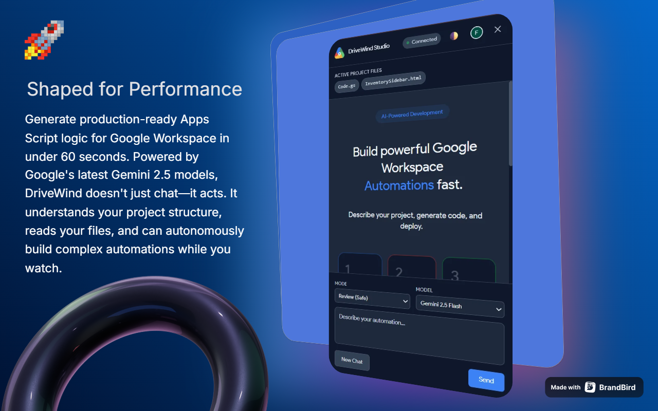 Stop copy-pasting. DriveWind injects Gemini-powered code directly into the Apps Script Monaco editor, preserving undo history and syntax highlighting. Secure, local, and agentic.